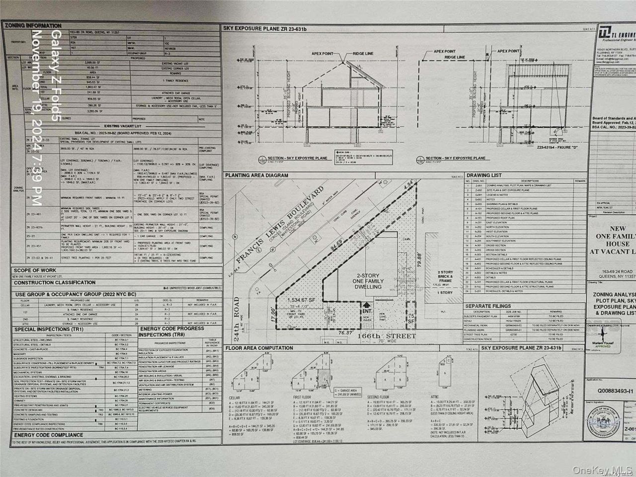 A Beautiful and great corner land on Francis Lewis Blvd with the lot size 3750SF and R2A Zoning. It is for sigle family house with approved BSA. The bluprint has a garage, basement, first floor,secondfloor, and attic.
